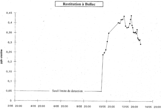 Seuil de détection fixé à 0,05 ppb. Sortie d'un 2e mode (bouffée de fluoréscéine) le 12 Mai au soir. Il s'agit d'une reprise des traceurs piégés lors d'une remise en charge des conduits. Un premier traçage a été réalisé par Astruc BRGM) en 1979