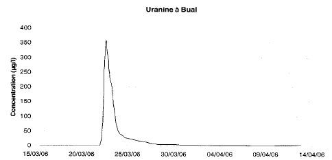 Une restitution en Uranine a été observée visuellement le 22 mars. Le 23 mars, la source était encore verte.