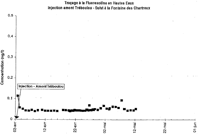 Les 7 et 8 Avril, plainte des abonnés signalant avoir de l'eau verte à leur robinet. Aucune restitution observée, lié à l'existence d'un exutoire drainant directement dans le Lot?